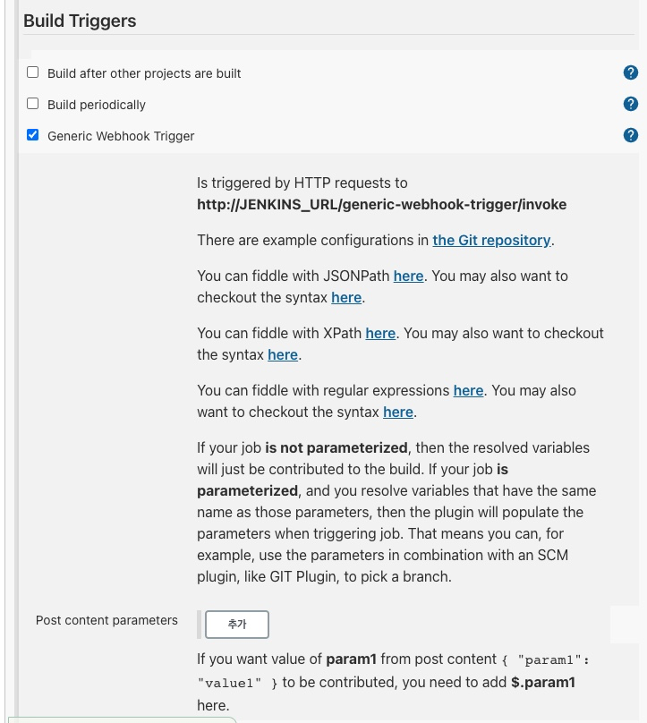 - [Jenkins] - [해당 서버] - [구성] -[Build Triggers] - [Generic Webhook Trigger 체크박스]