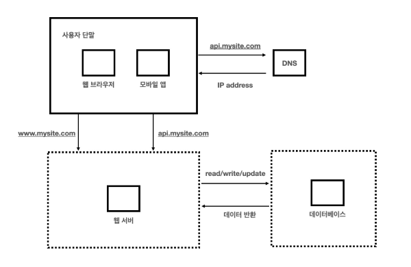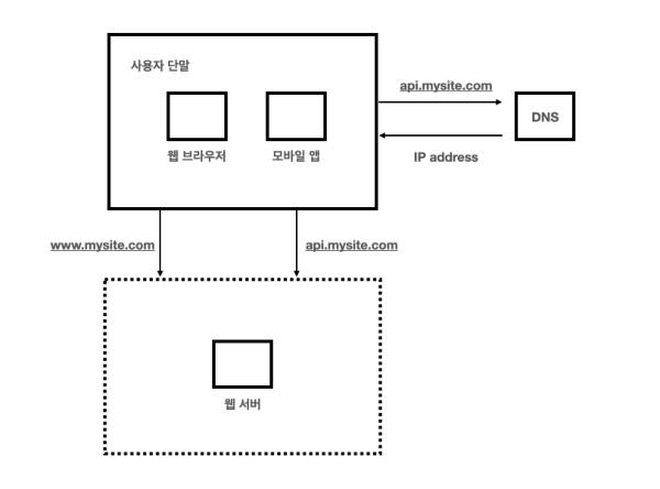 - 사용자는 도메인 이름(api.mysite.com)을 이용하여 웹사이트에 접속한다.