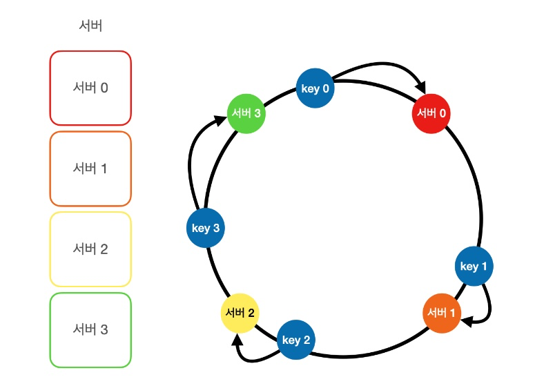 - 예를들어, key0은 서버 0에 저장되며, key1 은 서버1, key 2 는 서버2에 저장됩니다.