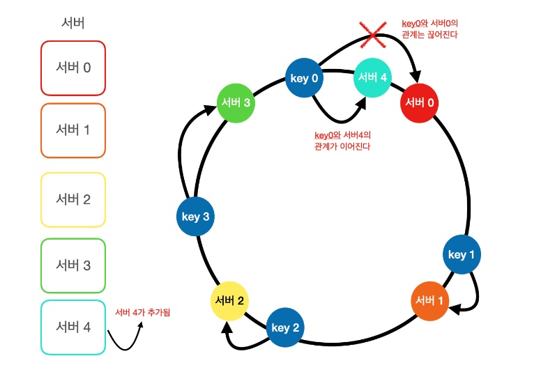 - 안정 해시를 사용했으므로, 서버를 추가하더라도 키 가운데 일부만 재배치 되고