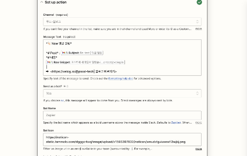 - 메세지 양식을 zapier 문서를 참고하였습니다.