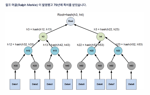 - 암호학이나 컴퓨터 과학에서 머클 트리(Merkle tree) 란 모든 자식 노드들이 암호학적 해시로 이뤄진 데이터 블록을 갖는 트리 형태의 자료 구조로 해시 트리(hash tree)라고도 부릅니다.