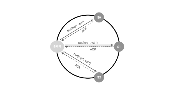 - 중재자(coordinator)는 클라이언트에세 키-값 저장소에 대한 프락시 역할을 하는 노드다.