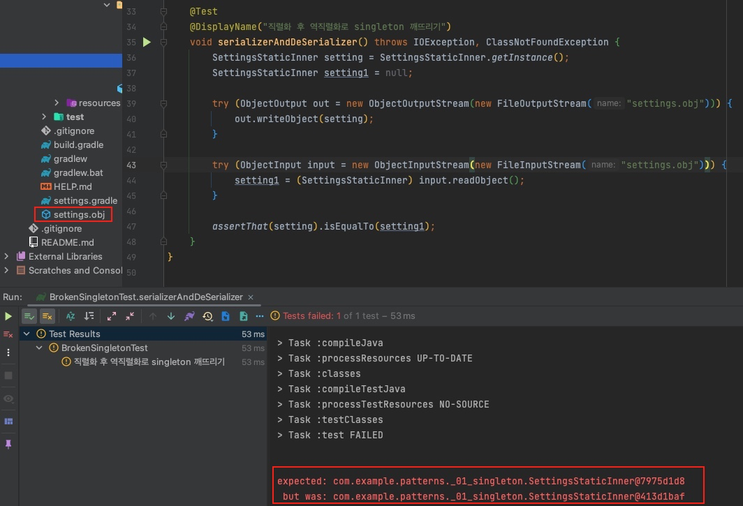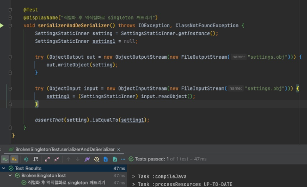 @DisplayName("직렬화 후 역직렬화로 singleton 깨뜨리기")