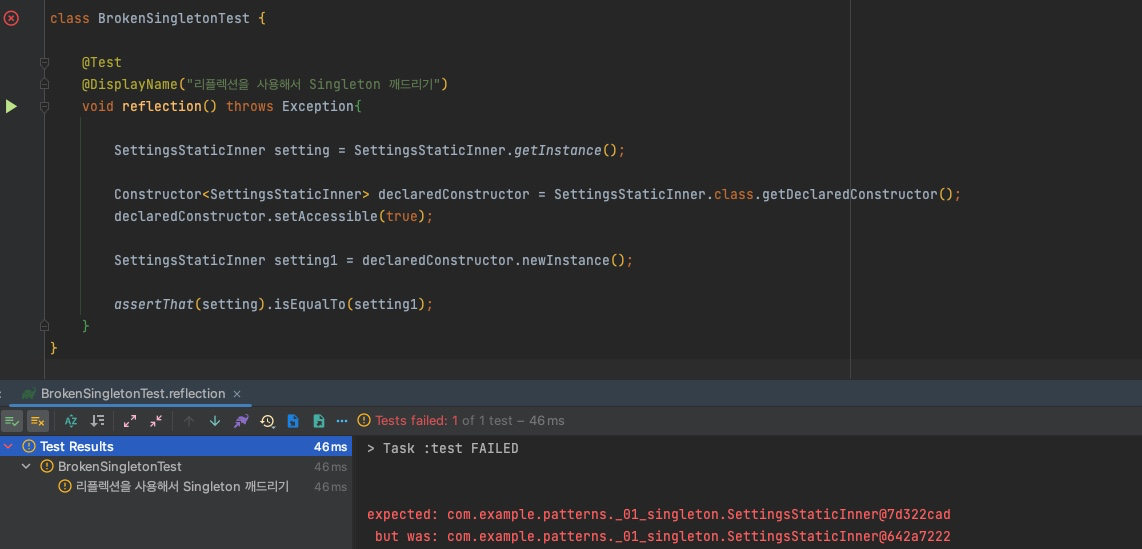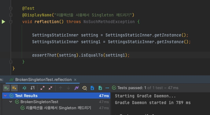 이렇게 리플렉션을 이용하여, 해당 객체의 생성자를 불러오고 → 접근제어를 풀고 → 새로운 인스턴스를 생성하여 싱글톤 객체의 제어에서 벗어날 수 있습니다.