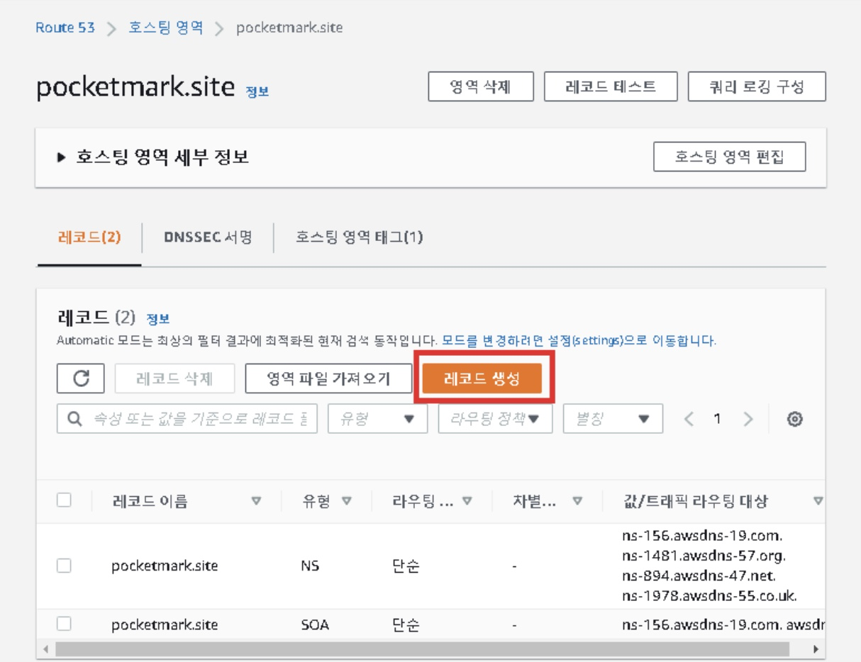 - 그다음 생성한 호스팅영역의 레코드를 생성해줍니다.