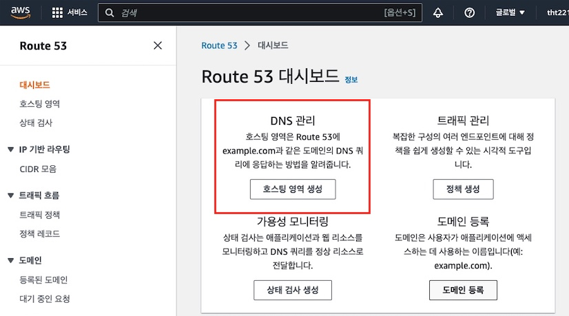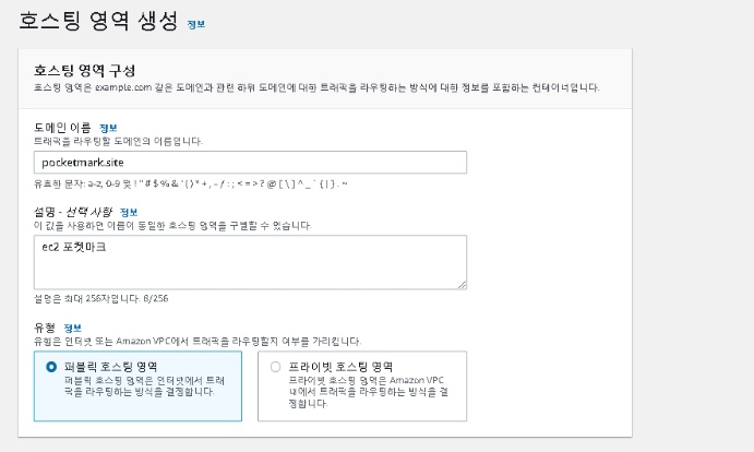 - aws 에서 Route 53 을 검색한 후 호스팅 영역을 생성해 주어야 합니다.