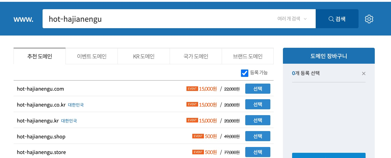 구매를 원하는 도메인을 검색하면 사용한 가능한 목록와 구매금액이 나옵니다.