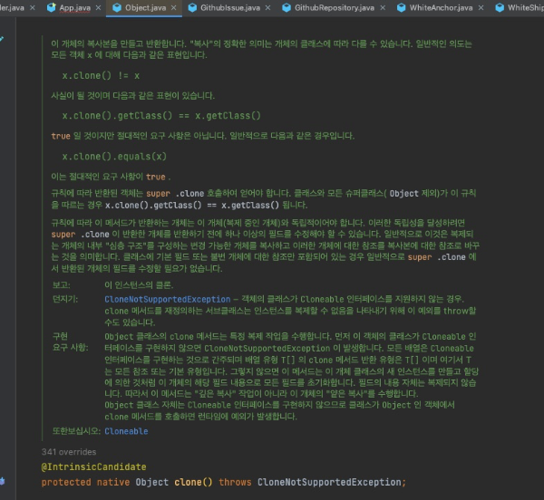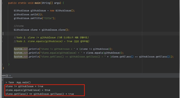 - clone != gitHubIssue → 다른 인스턴스가 새로 만들어지기 때문에 clone 한 객체는 기존 객체와 다른 객체여야 합니다.