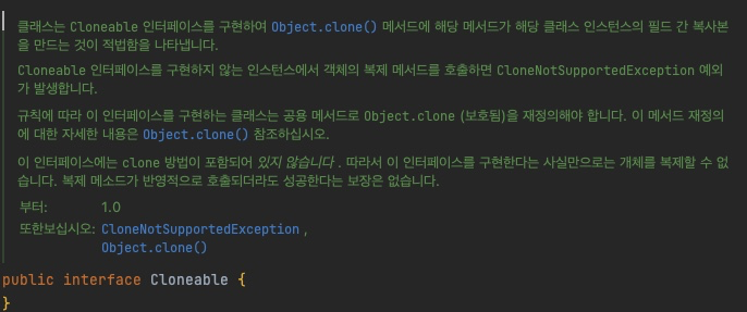 - 그러나, clone() 메소드는 얕은복사를 제공하고, 보통의 경우 아래와 같이 인터페이스를 반환하기 때문에 생성자를 이용해서 객체를 복사하는 방법을 주로 사용합니다.