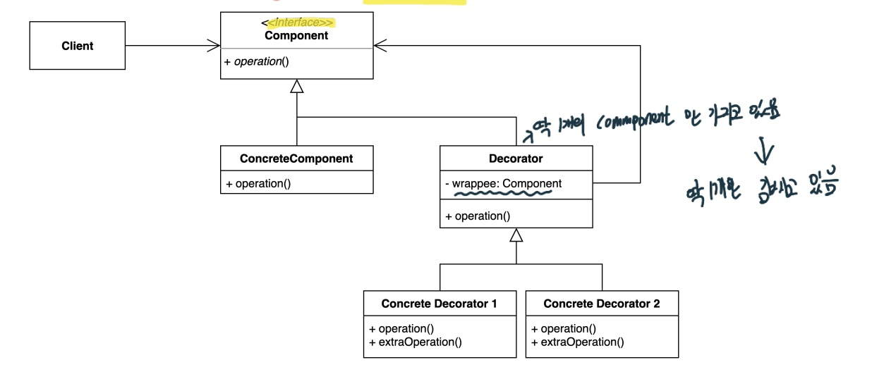 → 풀어설명하자면, Component 의 기능을 구현한 Decorator 는 부모 인터페이스를 멤버변수로 가지고 있기에 외부에서 의존성을 주입받을 수 있는 상태가 되고