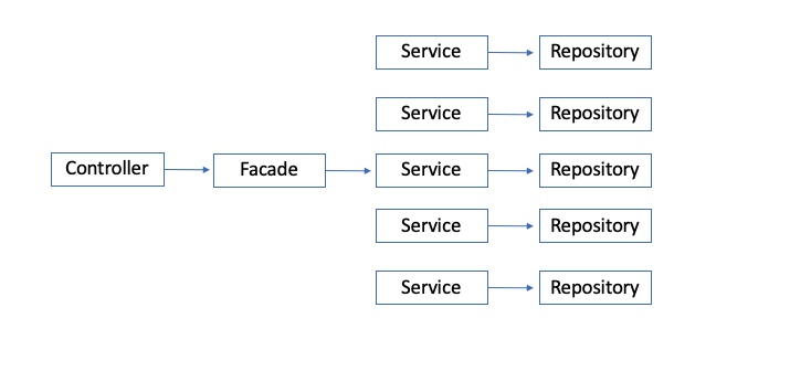 기존의 레이어드 아키텍쳐에서 Controller 와 Service 사이에 Facade (정문) 을 두어 1 개의 Service 레이어는 1개의 Repository 더 나아가서 1개의 Entity에 대한 로직만을 수행하게 됩니다.