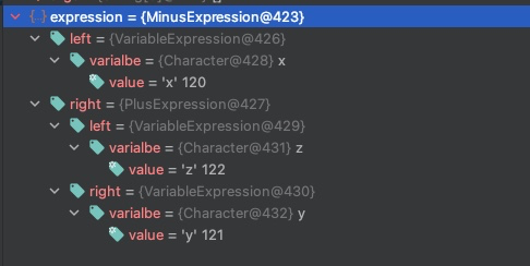 int result = expression.interpret(Map.of('x', 1, 'y', 2, 'z', 3));
