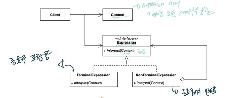 → 인터프리터 패턴은 이 NonTerminalExpression 을 통해 해석한 문자를 다음 해석이 가능한 또다른 Expression으로 넘기면서, TerminalExpression만 남으면, 해석된 마지막 문자를 반환하여 interpreter 로써의 기능을 수행하는 구조를 가집니다.