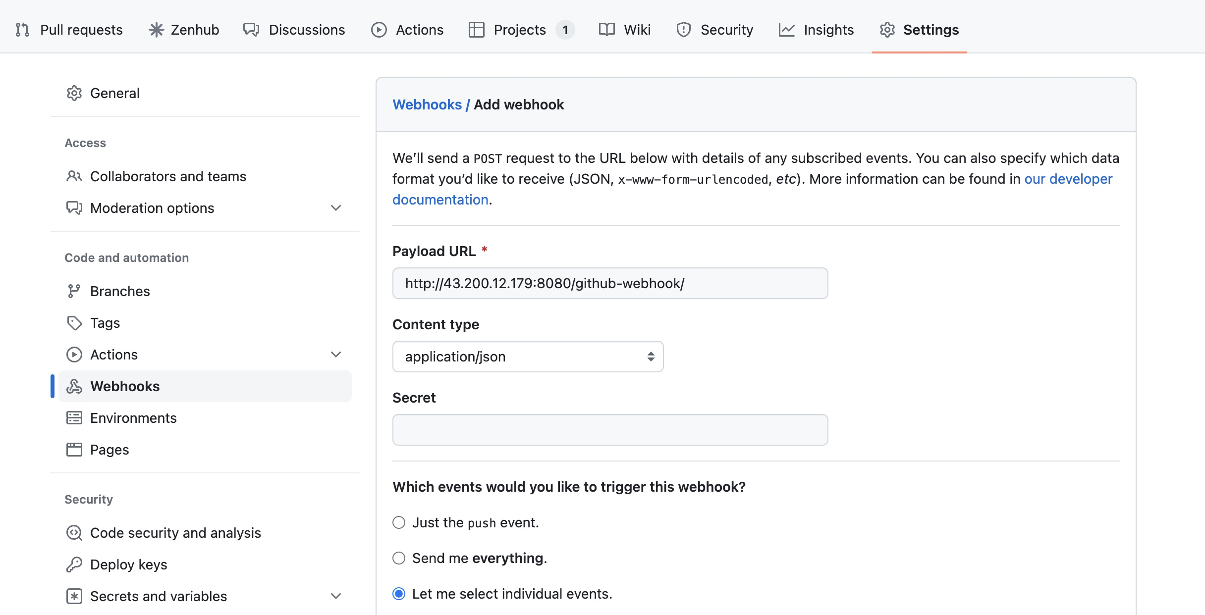 - 그리고 밑에서 깃허브가 어떤 이벤트가 일어났을 떄 Webhook을 날릴것인지 선택할 수 있습니다. 저는 PR 을 선택했습니다.