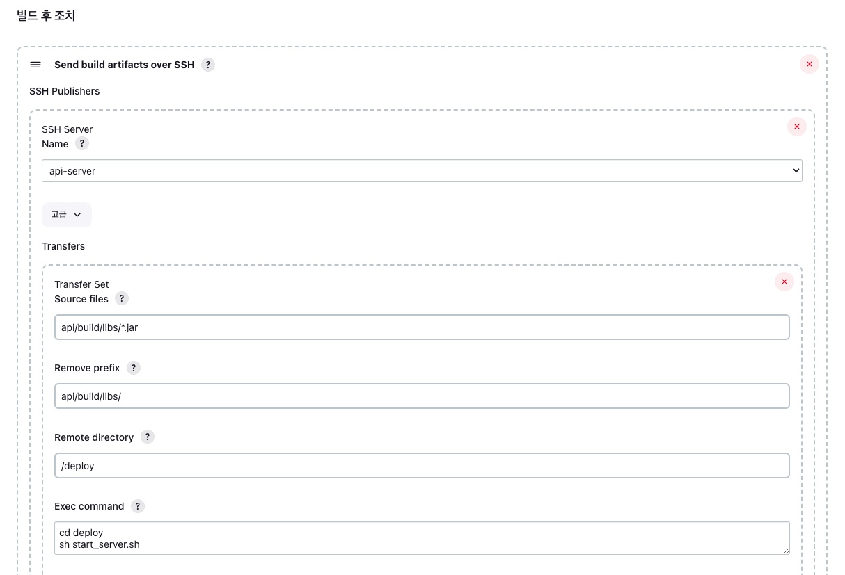 선택하면 SSH 정보와 전송할 파일, 전송 이후 작업 등을 추가해야 합니다. SSH Server 정보는 위에서 추가한 "api-server" 가 기본적으로 세팅되어 있습니다.