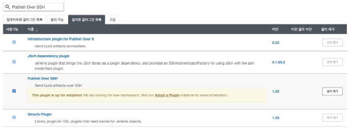 - [Jenkins 관리] → [플러그인 관리] → [설치가능 플러그인] → Publish Over SSH 검색