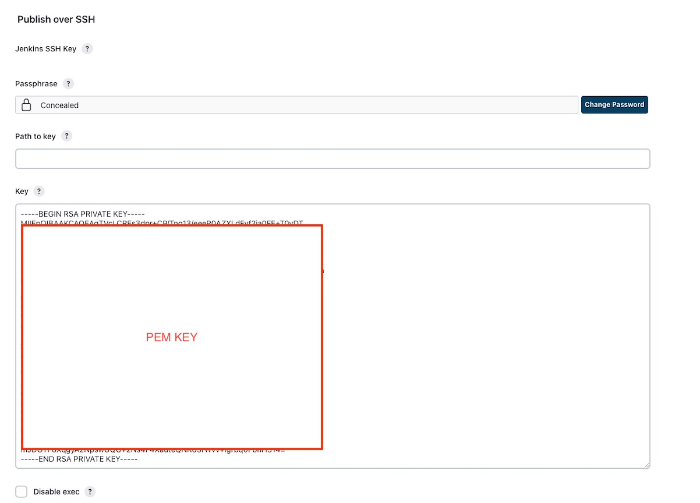 - Key에는 AWS EC2 인스턴스 생성 시 발급받은 RSA 키가 필요합니다. EC2 생성할 때 받은 ssh 접속 키인 pem 파일내용을 붙여넣기를 하면 됩니다.