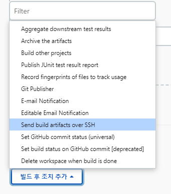 - 빌드 후 조치 추가를 누르면 Send build artifacts over SSH가 추가되어 있습니다.