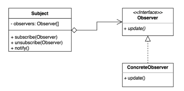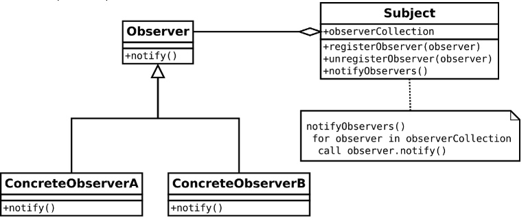 - 객체의 상태변화를 관찰하는 옵저버(관찰자)들의 목록을 객체에 등록하여 상태 변화가 있을 때 마다 notify를 통해 객체가 직접 목록의 각 옵저버에게 통지하고 → 각각의 옵저버는 이러한 "이벤트"가 발생했을 시 처리할 동작을 수행합니다.