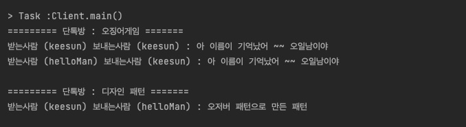 chatServer.sendMessage(user2, "디자인 패턴", "오저버 패턴으로 만든 패턴");