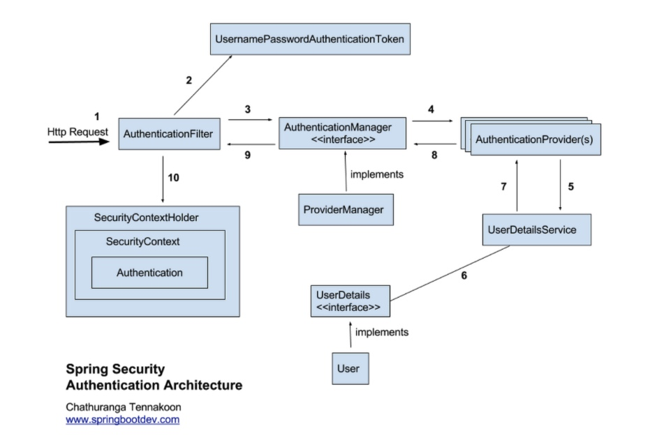 - AuthenticationFilter가 (1) 의 정보를 인터셉트하여 UsernamePasswordAuthentication Token (Authentication 객체) 을 생성하여 AuthenticationManager에게 Authentication 객체를 전달