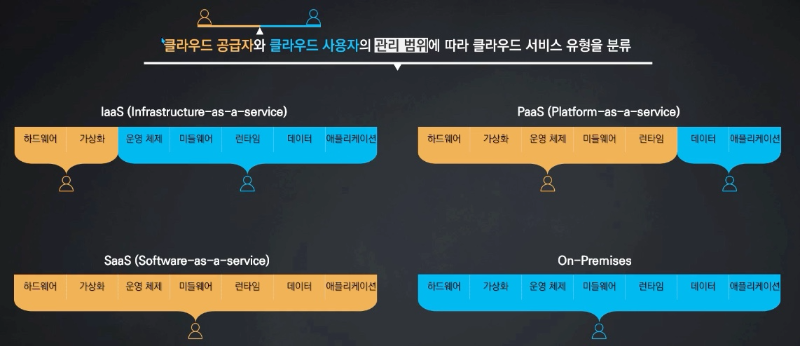 💡 클라우드 컴퓨팅 서비스 유형은 클라우드 공급자와 클라우드 사용자 간의 관리 범위가 어디까지인가에 따라 분류할 수 있습니다.