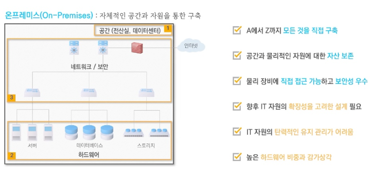 - 실제 서버, 데이터베이스, 스토리지 등과 같은 IT 자원들의 하드웨어를 보유하고 있어야 함