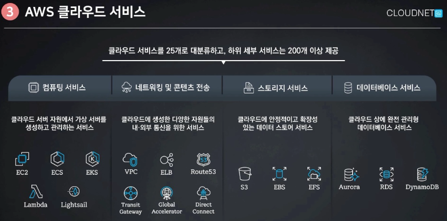 Aws 는 클라우드 서비스를 크게 25개로 대분류하고, 하위 세부 서비스만 200개 이상이 존재합니다.