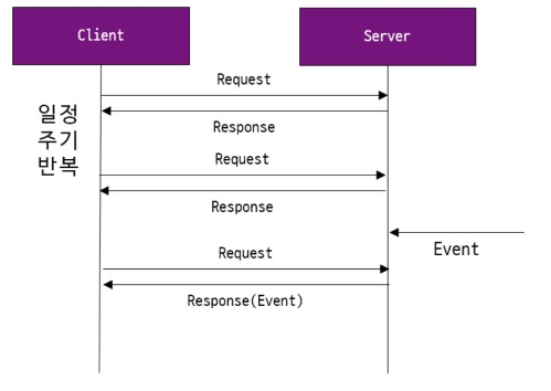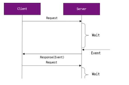 - HTTP 요청 시 서버는 해당 연결을 바로 해제하지 않고 일정시간 대기시킨다. 대기 시간 중 데이터가 업데이트(변경)가 일어났으면 바로 클라이언트에게 응답을 보내고 전달 받은 데이터를 처리한다. 응답을 받은 클라이언트는 바로 서버에 다시 요청을 보낸다