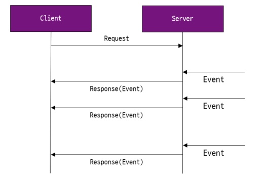 - 서버에 연결 요청을 보내놓고 계속 응답 데이터를 다운받는다. 서버는 이벤트가 발생하면 응답을 보낸다 (클라이언트가 서버에 데이터를 보내기가 힘들다)