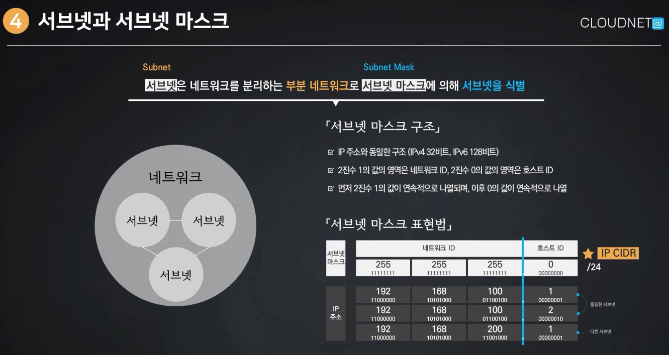 - 이러한 다수의 서브넷을 식별하기위해 서브넷 마스크라는 주소로 구분할 수 있습니다.