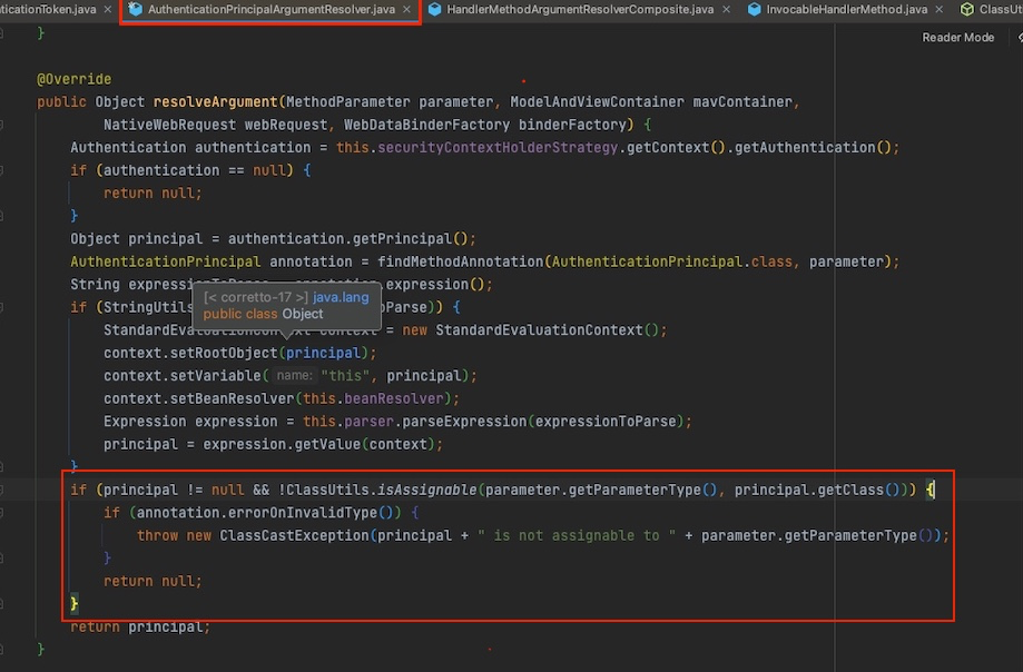 - 해당 정보를 불러온 User 객체(principal.getClss())와 바인딩하고자하는 파라미터 객체 (parameter.getParameterType()) 을 비교하여 맞지않으면 null 을 반환해줍니다.