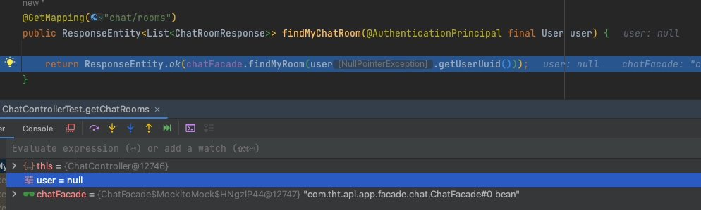 📌 하지만, @WithMockUser를 사용하면 Spring security.core.userdetails의 User객체가 들어가기 때문에 아래와같이 직접 생성한 특정 User 객체를 이용할 때는 Error가 발생합니다.