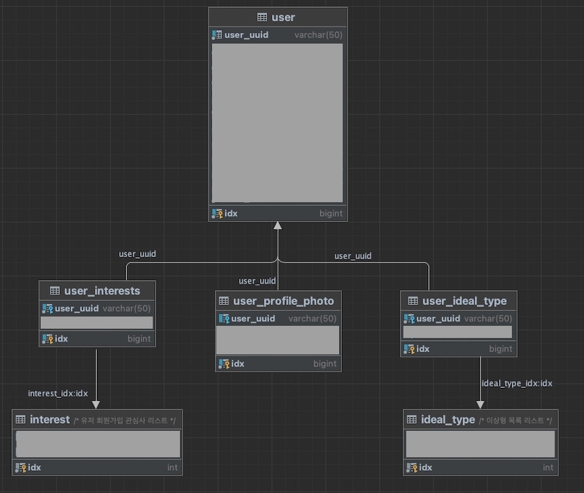 - 유저 컬럼 1당 - 이상형 3, 관심사 3, 프로필 3 의 행이 매칭되어 27개의 컬럼 결과값이 생성됩니다.