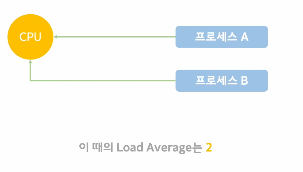 - cpu 1대, 실행중인 프로세스가 2대 일 때 = load average 는 2 입니다. (이 때는 os 스케쥴링 알고리즘에의한 context switching 이 일어납니다.)