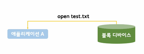 - 애플리케이션 A 가 open() System Call 을 사용하여 → 블록디바이스(EBS) 에서 test.txt 라는 파일을 불러오는 상황이 있다고 한다면