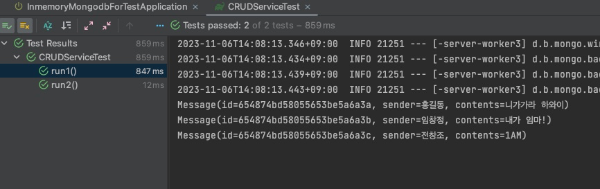 - 각 테스트 메소드끼리 영향을 주지 않기위해, 시작전 mongoDB 를 초기화 시켜주었습니다.