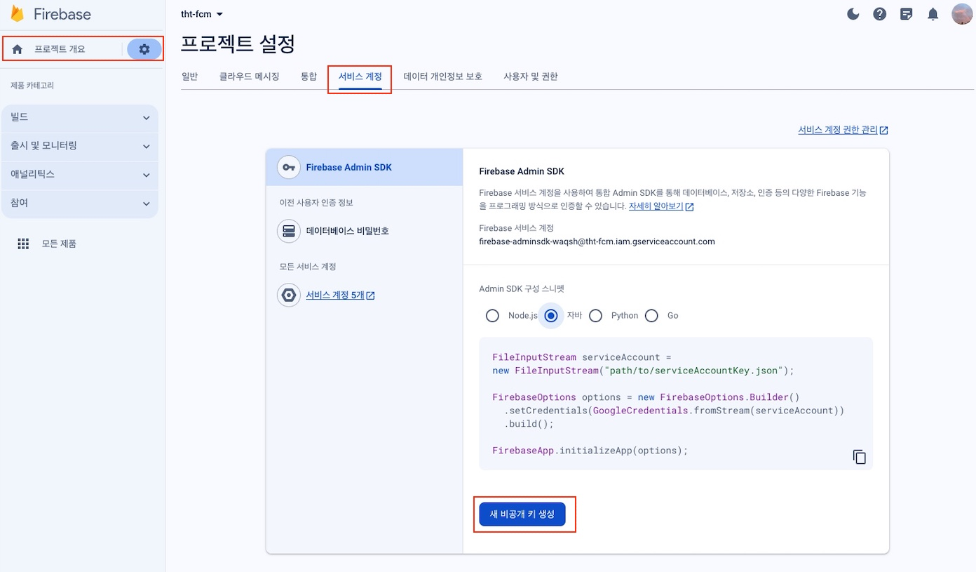 [프로젝트 생성] → [프로젝트 개요] → [서비스 계정] → [새 비공개 키 생성]