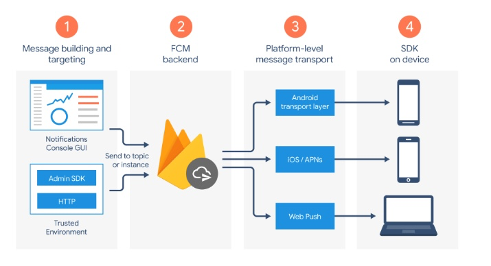 - Firebase 에서 제공하는 GUI 혹은 신뢰할 수 있는 서버 환경에서 Firebase Admin Sdk 나 FCM 서버 프로토콜을 사용하여 메세지를 FCM Backend 서버에 전송합니다.