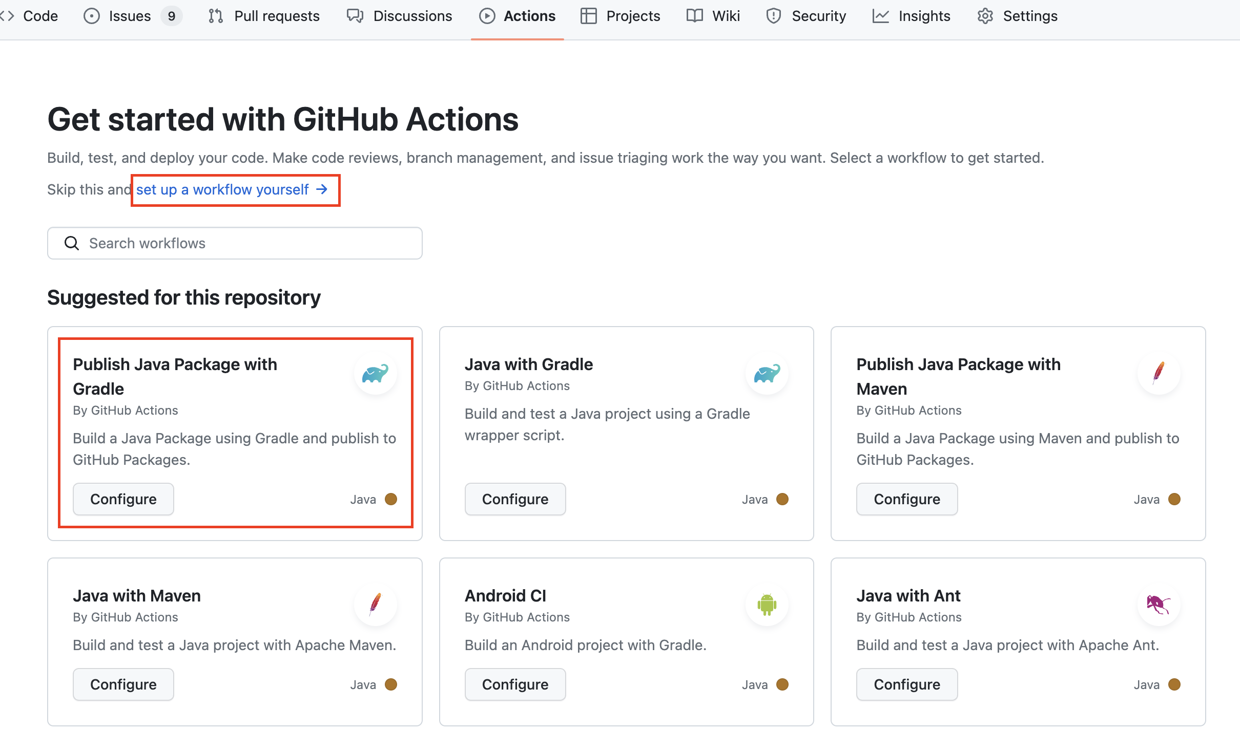 - 저는 [Publish Java Package with Gradle] 템플릿을 클릭해보았습니다.