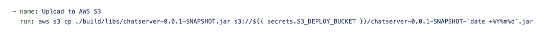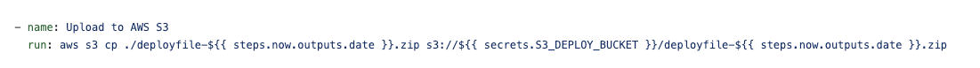 run: aws s3 cp ./deployfile-${{ steps.now.outputs.date }}.zip s3://${{ secrets.S3_DEPLOY_BUCKET }}/deployfile-${{ steps.now.outputs.date }}.zip