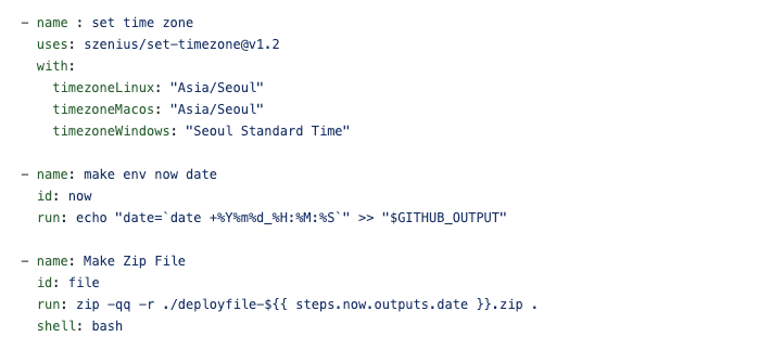 run: zip -qq -r ./deployfile-${{ steps.now.outputs.date }}.zip .