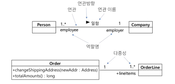 - 역할명 : 각 클래스간의 연관관계의 역할명을 가질 수 있음