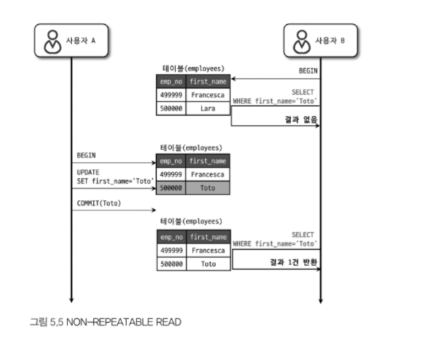 - 특정 시점에 다른 트랜잭션에 의해 데이터가 변경 후 commit 이 안료되면, 작업 중인 트랜잭션에 데이터를 조회하는 결과값이 달라집니다.