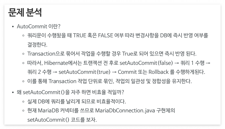 autocommit = false 하는 쿼리가 날아갑니다. (성능 최적화 가능 지점)
