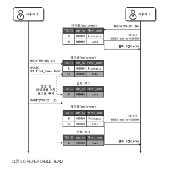 - REPEATABLE READ 수준에서는 언두 영역에 백업된 이전 데이터를 이용해 동일 트랜잭션 내에서는 반복해서 데이터를 조회하더라도 동일한 결과값을 보여줄 수 있도록 보장합니다.