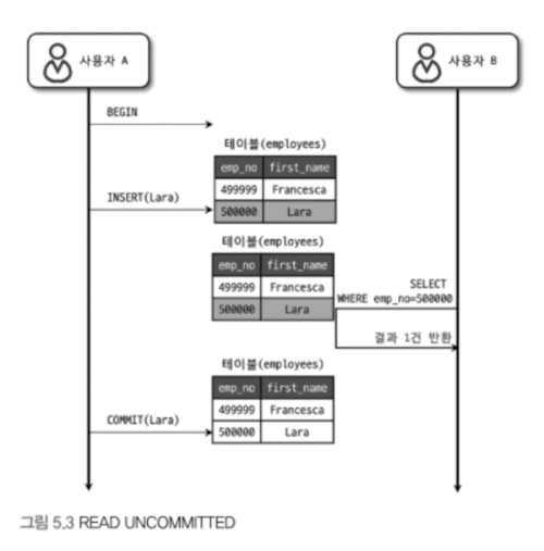 - 이처럼 어떤 트랜잭션에서 처리한 작업이 완료되지 않았음에도 다른 트랜잭션에서 볼 수 있는 현상을 "더티 리드(Dirty Read)"라고 합니다.