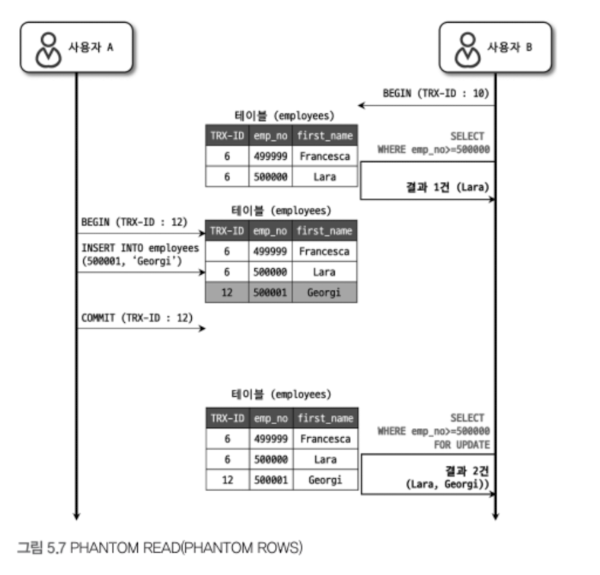 "다만, 엄밀하게 말해서 "SELECT ... FOR UPDATE" 또는 "SELECT ... FOR SHARE" 쿼리의 경우 REPEATABLE READ 격리 수준에서 PHANTOM READ 현상이 발생할 수 있다."