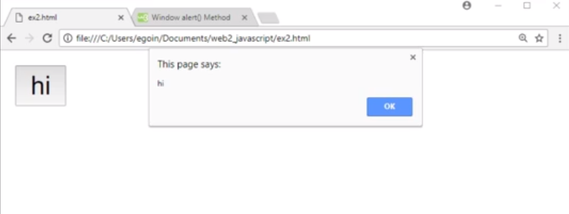 HTML 태그 안에서 onclick 속성은 javascript 코드를 가지게 됩니다. 그리고 onclick이 포함된 태그가 클릭되었을 때 이 javascript 코드에 따라서 웹 브라우저가 동작됩니다. 즉, 위의 코드에서 웹 브라우저는 alert('hi') 라는 코드를 기억하고 있다가, 사용자가 클릭하면 이를 실행해주는 것입니다.